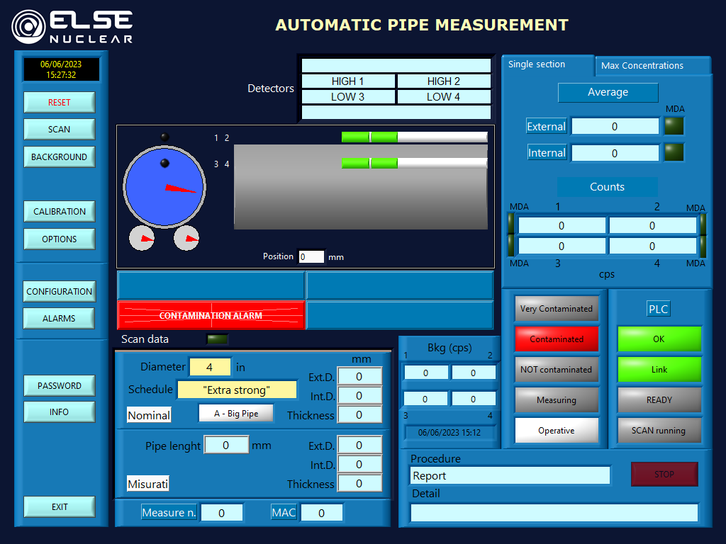 After loading the pipe, PIPE SCANNER runs a series of preliminary tests through optical devices, i.e. diameter and length measurement, and roughness check. After all the preliminary checks have been carried out, the measurement cycle starts: the pipe length is automatically divided in portions to be scanned by the detectors, and the system acquires the radiometric data for each portion separately. The system can also detect hot spots of contamination. At the end of the scanning a measurement report is produced. Safety devices and a perimeter infrared barrier prevent any dangerous man/machine interaction.